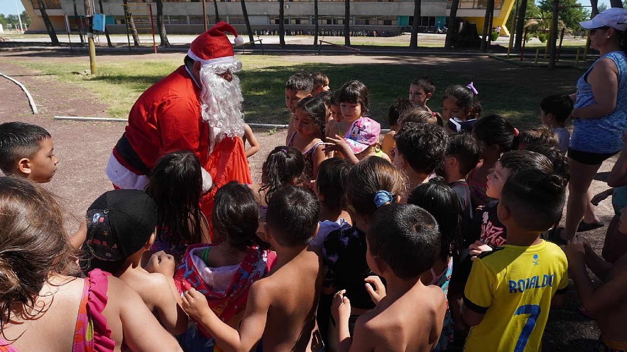 Papá Noel visitó la colonia de verano que se desarrolla en el Polideportivo Municipal y compartió una jornada con cientos de niños que asisten diariamente a las actividades organizadas por la Municipalidad de General Alvear.