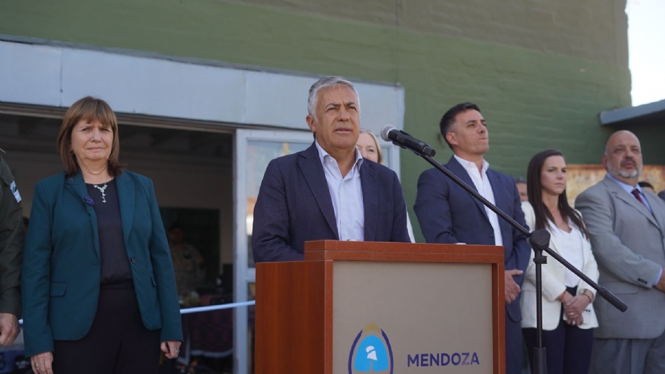 Bullrich estuvo acompañada por el intendente de Guaymallén, Marcos Calvente; el ministro de Defensa, Luis Petri; la ministra de Seguridad de Mendoza, Mercedes Rus, y el propio gobernador Cornejo.