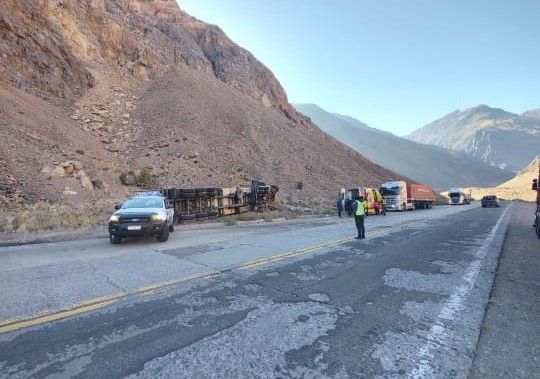 Un camión volcó en la mañana de este jueves en la Ruta Nacional 7, a la altura de Punta de Vacas, en el sector conocido como la "Curva del Tiempo". El siniestro ocurrió en solitario y fue alertado al 911 por conductores que transitaban por la zona.