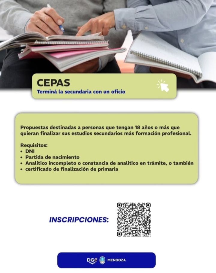 La Dirección de Educación Permanente de Jóvenes y Adultos (DEPJA) informa que están abiertas las inscripciones para aquellas personas mayores de 18 años interesadas en finalizar sus estudios de nivel secundario con formación profesional a través de los Centros de Educación Profesional para Adultos de Nivel Secundario (CEPAS). Actualmente, se encuentra abierta la nueva oferta en esta modalidad, lo que ha requerido un proceso de organización progresiva para garantizar el ingreso de cada estudiante.