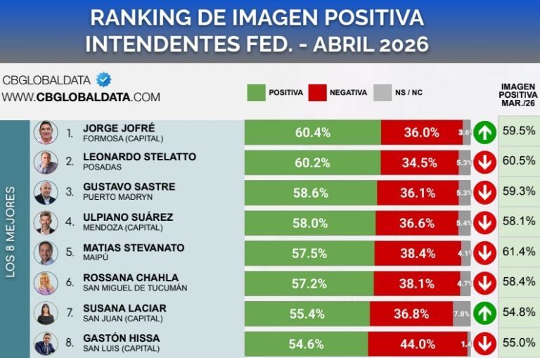Asimismo, el ranking ubica en los primeros lugares a Jorge Jofré (Formosa), Leonardo Stelatto (Posadas) y Gustavo Sastre (Puerto Madryn), configurando un escenario en el que los liderazgos locales con fuerte anclaje territorial y gestión visible continúan captando los mayores niveles de aprobación ciudadana.