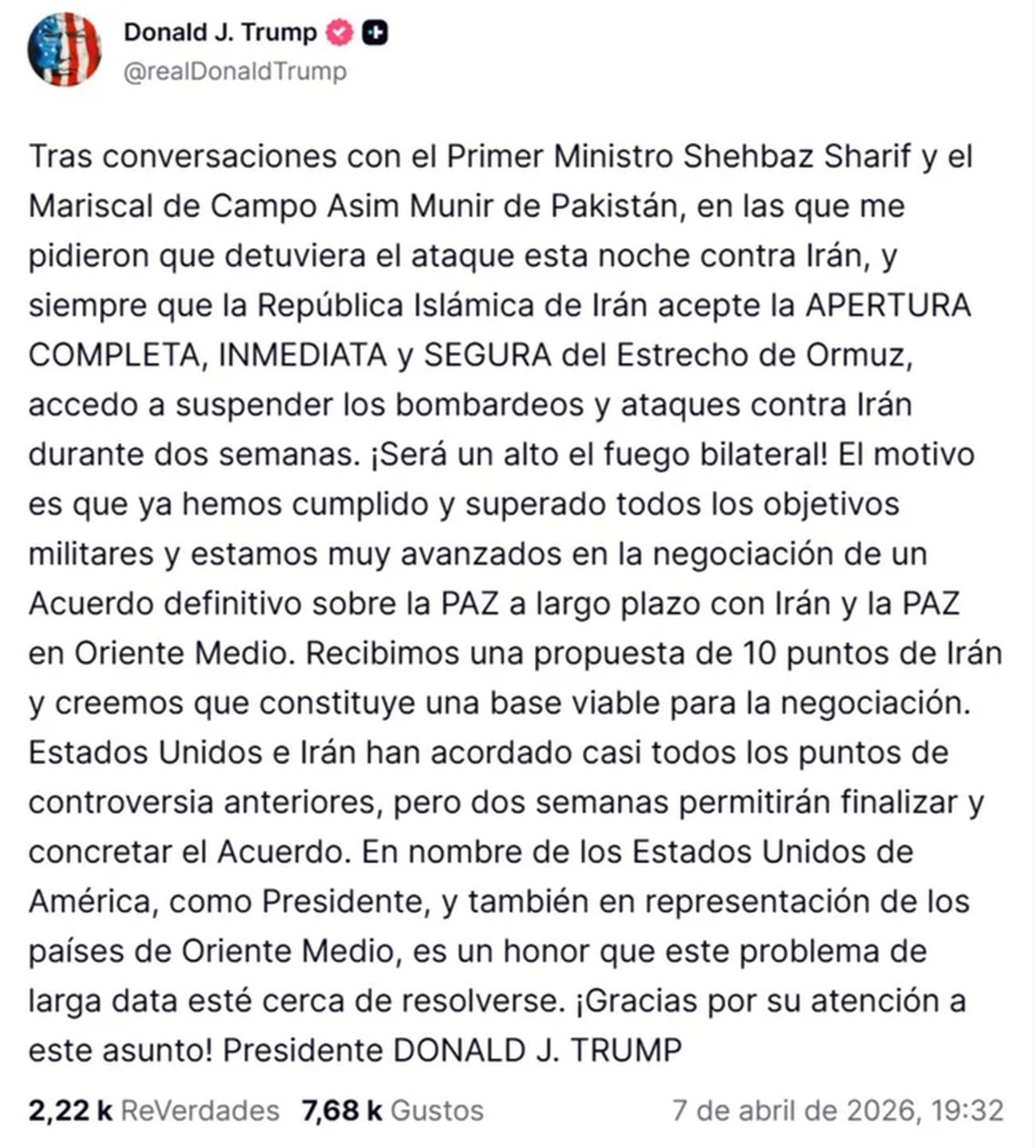 "Recibimos una propuesta de 10 puntos de Irán y creemos que constituye una base viable para la negociación. Estados Unidos e Irán han acordado casi todos los puntos de controversia anteriores, pero dos semanas permitirán finalizar y concretar el Acuerdo", agregó Trump.