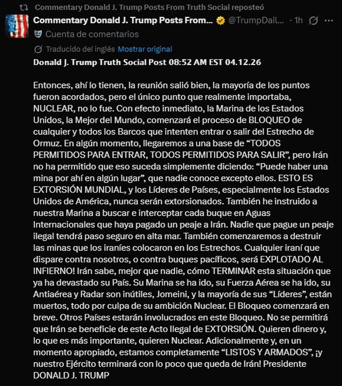 "Con efecto inmediato, la Armada de Estados Unidos -la mejor del mundo- comenzará a bloquear a todos los buques que intenten entrar o salir del estrecho de Ormuz. En algún momento llegaremos a un acuerdo en el que todos podrán entrar y salir libremente, pero Irán no lo ha permitido", expresó en su cuenta de la red Truth Social.