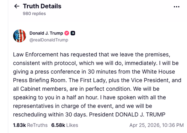 El Presidente siguió publicando en la red social y aprovechó para destacar la labor del Servicio Secreto. "Una noche memorable en Washington D.C. El Servicio Secreto y las fuerzas del orden hicieron un trabajo fantástico. Actuaron con rapidez y valentía", dijo Trump quien aseguró: "El tirador ha sido detenido y he recomendado que "el espectáculo continúe", pero seguiremos las indicaciones de las fuerzas del orden. Tomarán una decisión en breve. Independientemente de esa decisión, la noche será muy diferente a lo planeado y, sencillamente, tendremos que repetirla".