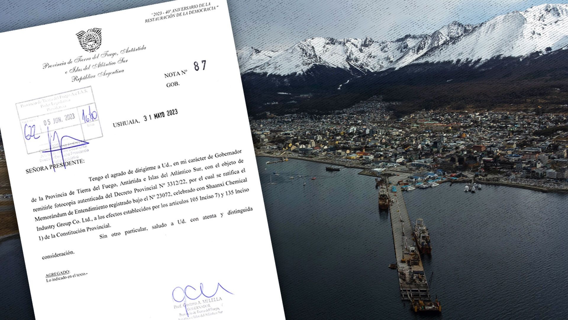 El gobernador Gustavo Melella ratificó mediante el decreto provincial 3312/22 la construcción de la base naval y dio giro a Mónica Urquiza, presidenta de la Legislatura de Tierra del Fuego, para que sea tratado por sus diputados. El acuerdo fue firmado con la empresa estatal china Shaanxi Chemical Industry Group Co. Ltd.