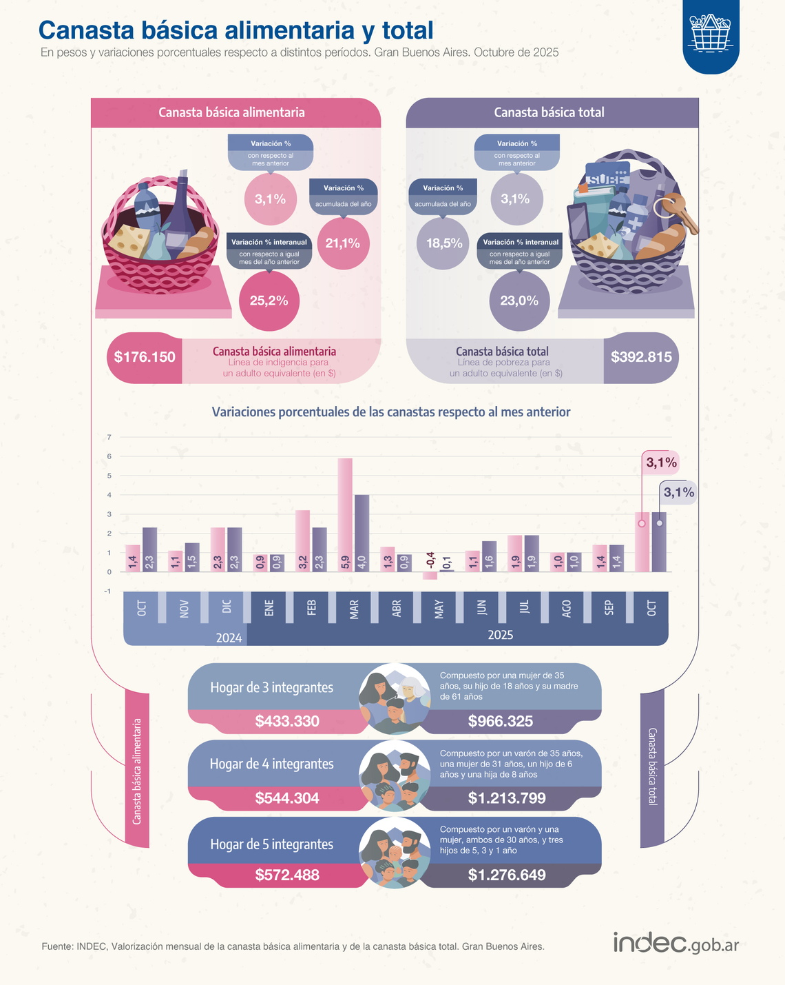 Desde enero hasta octubre, la CBA y la CBT acumulan incrementos del 21,1% y 18,5%, respectivamente. En comparación con el décimo mes del 2024, se registraron subas del 25,2% para la CBA y 23% para la CBT, según lo difundido por el organismo. Las canastas de los hogares