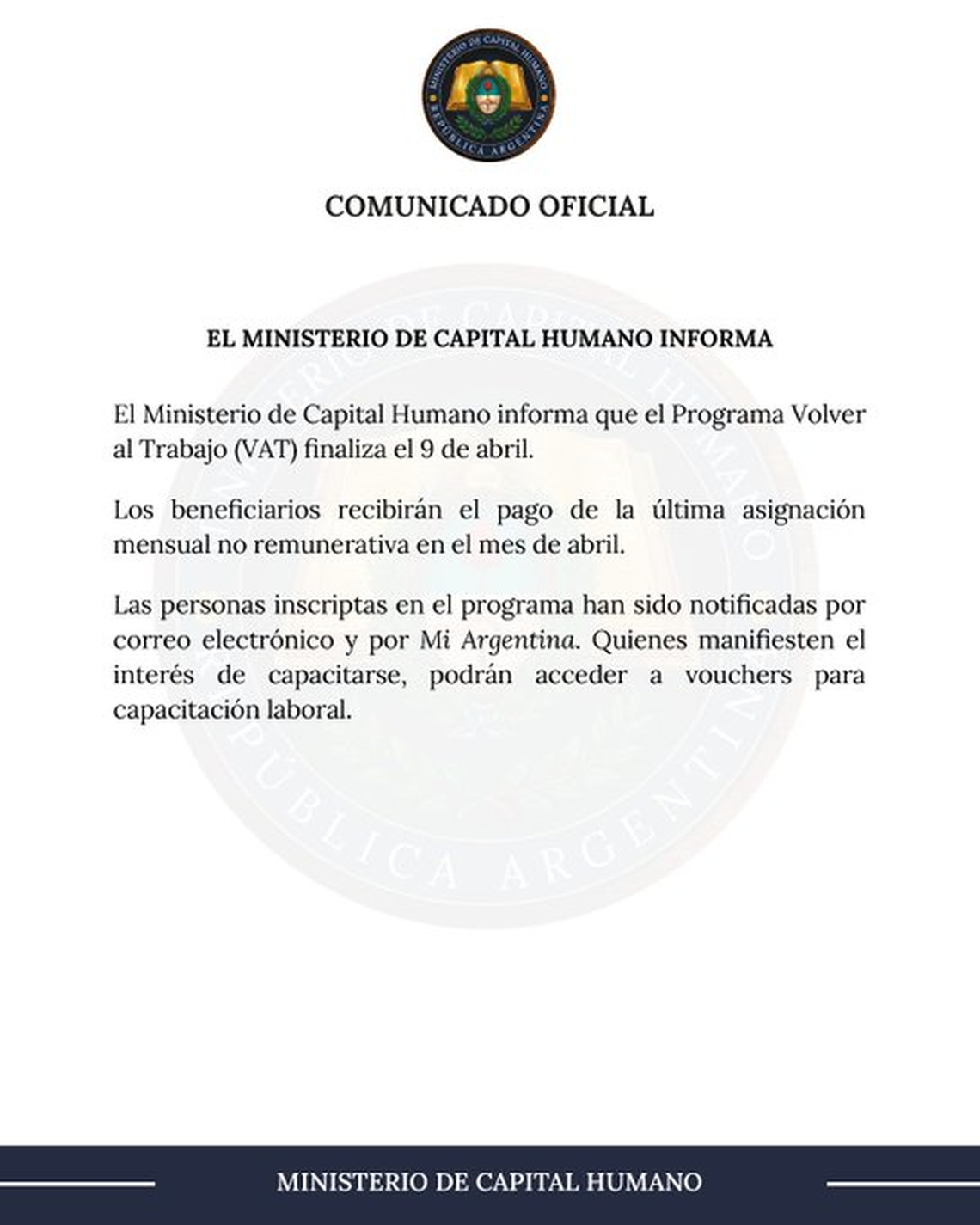 El Ministerio de Capital Humano, a cargo de Sandra Pettovello, adelantó a través de la red social X que el 9 de abril será el último día donde los beneficiarios "recibirán el pago de la última asignación".