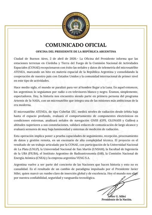La Oficina del Presidente informó que las estaciones terrenas de Córdoba y Tierra del Fuego, pertenecientes a la CONAE, recepcionaron con éxito señales y telemetría del microsatélite ATENEA.
