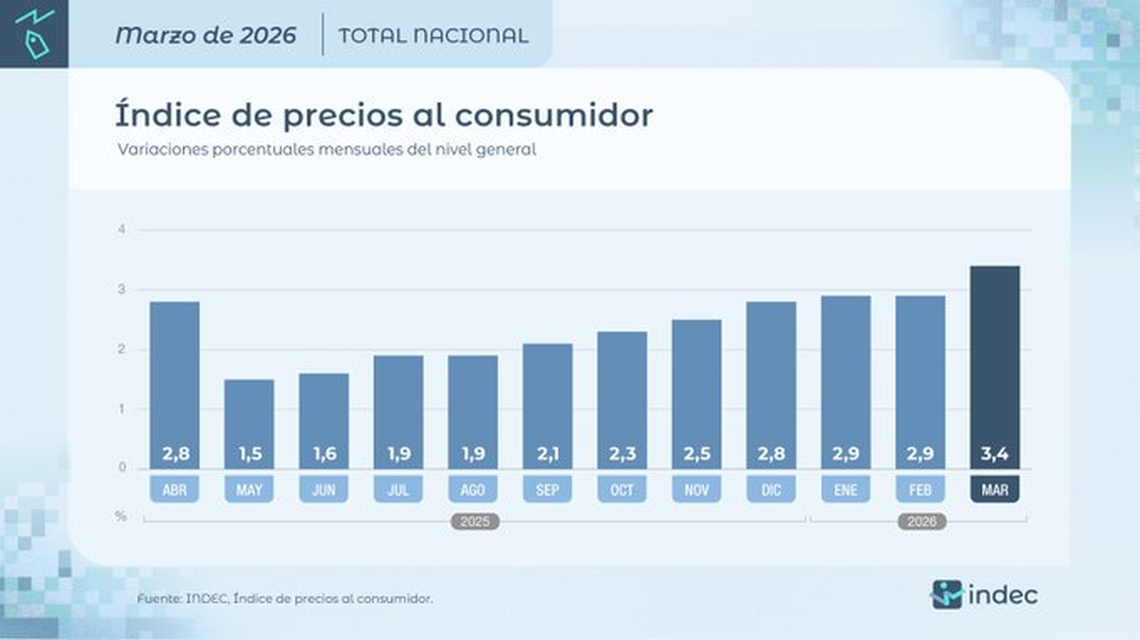 La inflación de marzo informó este martes el Instituto Nacional de Estadísticas y Censos (Indec) y acumuló un alza del 9,4% en lo que va de 2026, un año en que el Gobierno estimó que el aumento de precios será del 10%. Por su parte, el aumento de precios al consumidor acumuló 32,6% en los últimos doce meses.