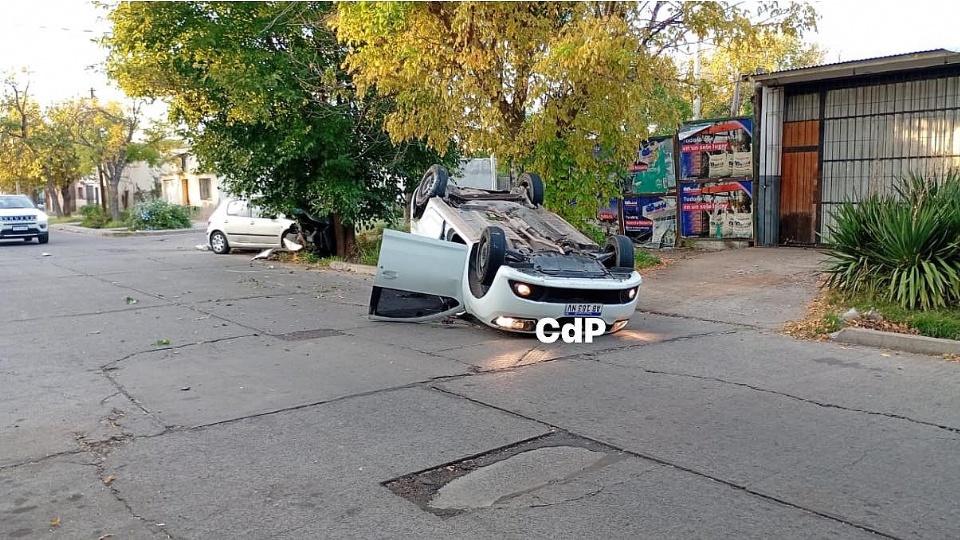 Como consecuencia del impacto, uno de los vehículos terminó volcado, mientras que el Peugeot fue a dar contra un árbol.
