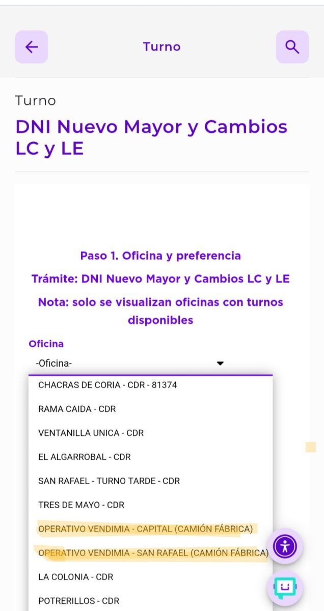 Luego de registrarse, el usuario debe buscar "Mis Turnos" e ingresar a "Nuevo Turno". Allí, a "Actualización DNI 5 años cumplidos" y solicitar turno. Se desplegará una lista de lugares y hacer click en Operativo Vendimia - Capital u Operativo Vendimia - San Rafael.