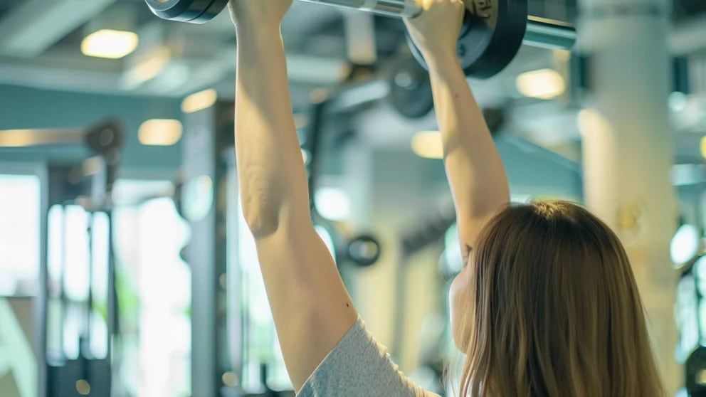 Press de tríceps sobre la cabeza con marcha: Avanzar los pies al ritmo de marcha original y levantar ambas pesas sobre la cabeza. Los codos deben apuntar hacia el cielo y estar doblados de modo que las pesas queden directamente detrás del cuello y las manos toquen los nudillos (posición inicial). Continuar marchando a derecha e izquierda y levantar las pesas hacia el cielo estirando los brazos. Marchar hacia la derecha, la izquierda y los antebrazos (dos tiempos para los pies = un tiempo para los brazos). Repetir durante un intervalo de 30 segundos.