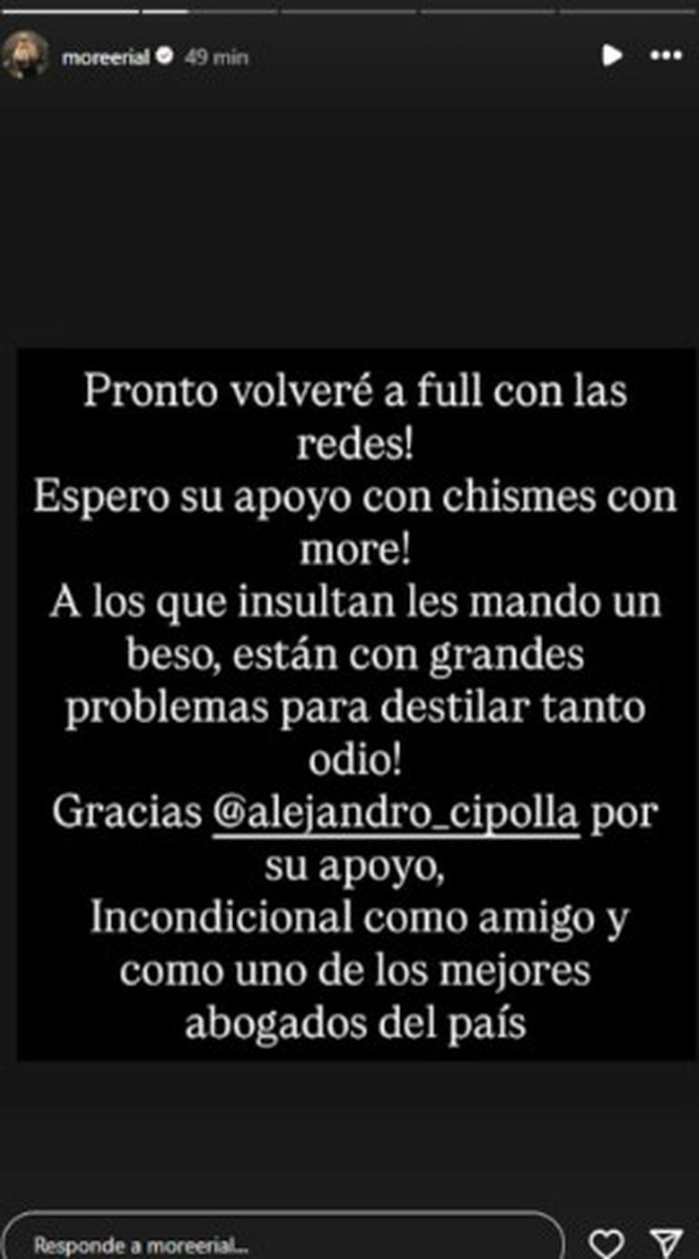 "¡Pronto volveré a full con las redes! ¡Espero su apoyo con chismes con More!", escribió en una historia con fondo negro. Sumado a esto, la cuenta que le pertenece apuntó contra las críticas que recibe por su situación: "A los que insultan, les mando un beso. Están con grandes problemas para destilar tanto odio".