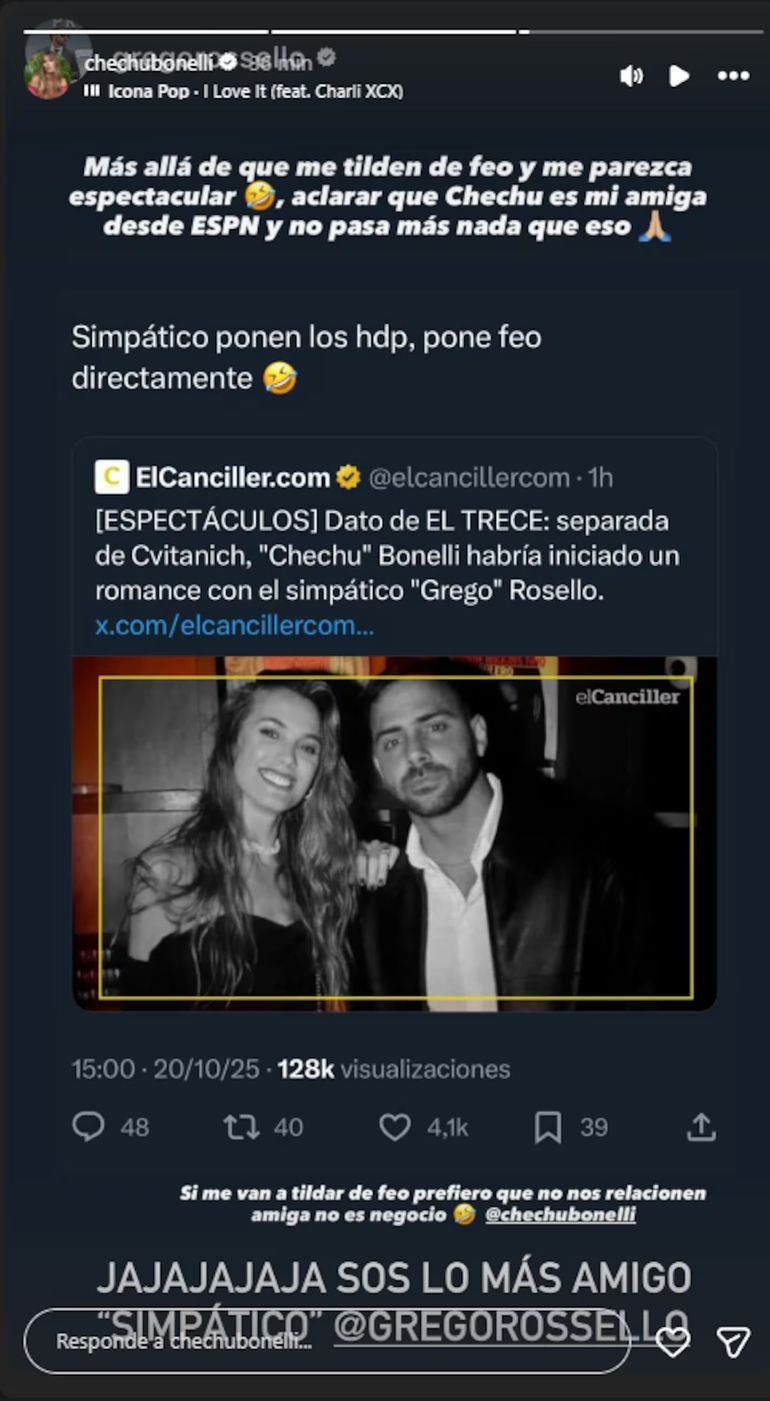"Más allá de que me tilden de feo y me parezca espectacular, quiero aclarar que Chechu es mi amiga desde ESPN y no pasa más que eso", afirmó Grego en una historia que subió a Instagram.